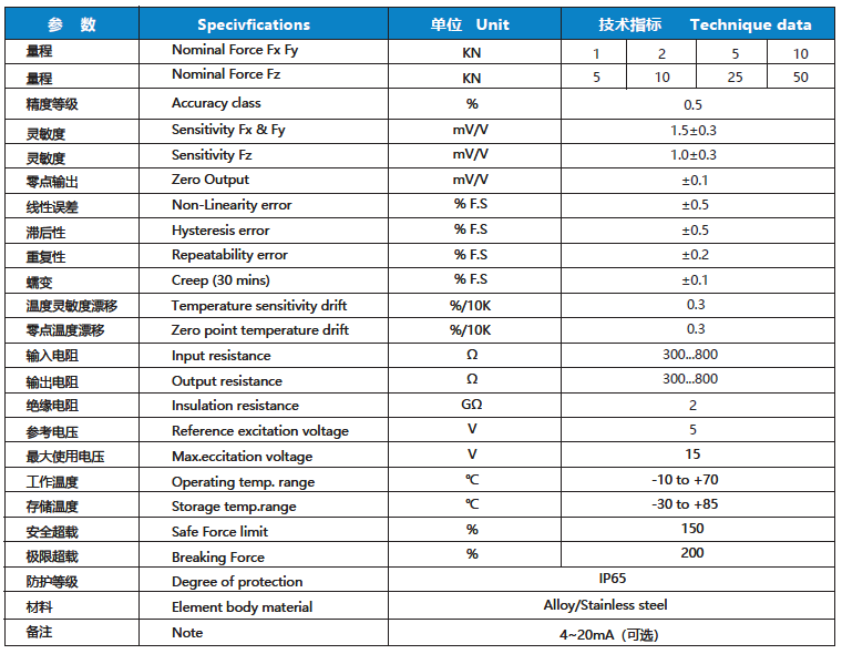 輸出:1mv/V、0~±5/10V、4~20mA可選